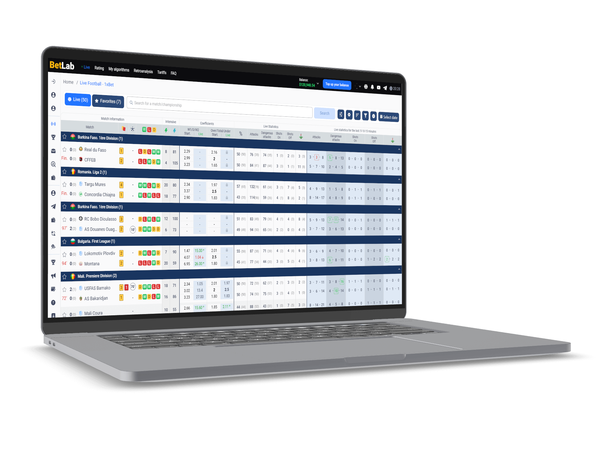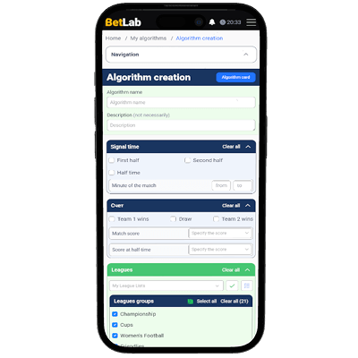 BetLab is a platform where you can create your own unique algorithms based on any conditions and criteria, using our advanced statistics and analysis tools. You can test strategies through retrospective analysis on past matches and instantly see their effectiveness without waiting for new events. The best algorithms are ranked and seen by thousands of users, and you can earn money from subscriptions by making strategies paid. If the algorithm's conditions are met, signals are sent instantly to Telegram, and you can connect your channels and share them with your audience. Live Scanner displays all key stats in real time, filters matches, and helps you make accurate predictions. Rankings and competition with other participants motivate players to create increasingly precise and effective strategies.